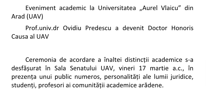 Ceremonia de acordare a titlului de Doctor Honoris Causa al Univeristatii Stefan Cel Mare din Suceava, domnului prof. univ. dr. Ovidiu Predescu